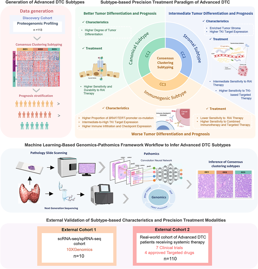 本研究对 113 例晚期 DTC 进行了蛋白质组学分析,识别出三种分子特征不同的亚型:经典型、基质型和免疫原型。这些亚型在驱动基因突变、组织病理学特征和临床结局方面存在差异。基于其独特的生物学特性,本研究针对每种亚型提出了不同的治疗策略。为了便于临床应用,本研究开发了一种机器学习分类器,该分类器利用常规可用的基因突变和数字病理数据能够准确预测这些亚型。通过单细胞和空间转录组学分析,在一个独立的队列中进一步证实了该分类的生物学意义。此外,对接受各种全身治疗的真实世界患者队列的分析也提供了初步的临床证据,支持该亚型分类框架在指导治疗决策方面的潜在应用价值。总而言之,本研究为未来探索晚期 DTC 的个体化治疗提供了理论依据和实用工具。