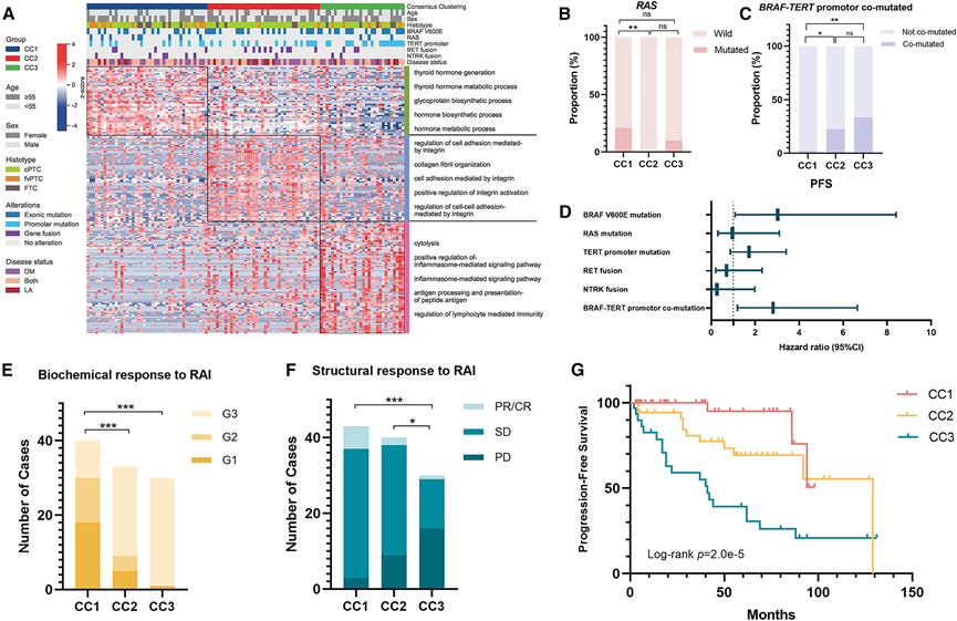(A) 热图显示了全球蛋白质组数据的 CC亚型。(B) 柱状图比较发现队列中各 CC 亚型RAS突变的比例。(C) 柱状图比较发现队列中CC 亚型中BRAF-TERT启动子共突变的比例。(D) 森林图总结了 Discovery 队列中不同基因改变状态的 RAI 后 PFS 的多变量 Cox 比例风险模型中的风险比和 95% 置信区间 (CI) ,并根据病理亚型进行了调整。(E) 柱状图比较了发现队列中三种CC亚型对RAI治疗的生化反应。(F) 柱状图比较了发现队列中不同CC亚型对RAI的结构反应。(G) 探索队列中不同CC亚型接受RAI治疗后的PFS的Kaplan-Meier生存曲线。