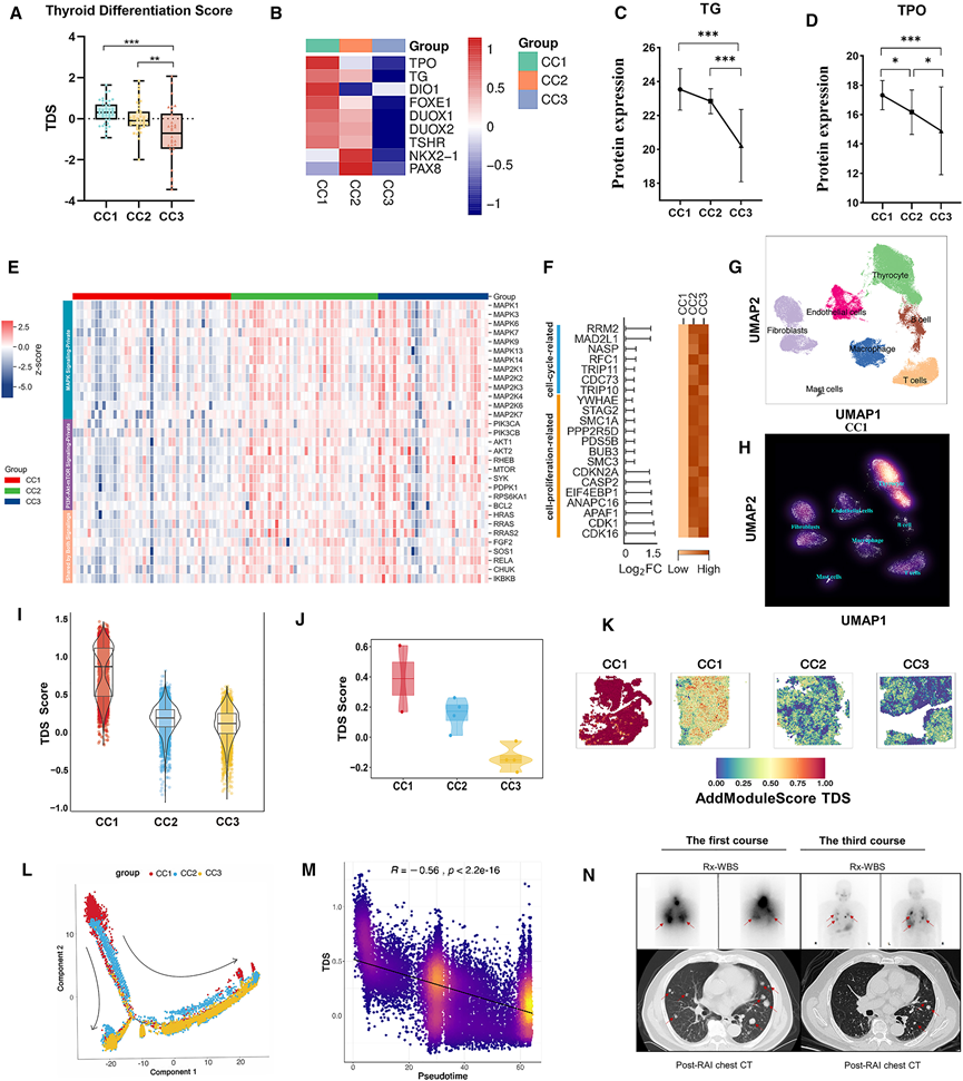 (A) 热图显示了发现队列( n = 113)中与 TDS 相关的基因的蛋白质组表达水平。(B) 热图显示了发现队列( n = 113)中与 TDS 相关的基因的蛋白质组表达水平。(C-D) 折线图比较了发现队列中三种 CC 亚型甲状腺分化标志物 TG和 TPO的蛋白表达。(E) 热图显示发现队列中 MAPK 通路和/或 PI3K/Akt/mTOR 通路中关键蛋白质的丰度。(F) 热图显示发现队列中三种 CC 亚型中细胞周期相关蛋白和细胞增殖相关蛋白的差异蛋白丰度。(G) 对 scRNA/spRNA-seq 队列(外部队列 1)中 10 个晚期 DTC 样本的 95578 个细胞进行均匀流形近似和投影 (UMAP) 可视化。(H) 密度图可视化展示了外部队列 1中两个 CC1 样本中七种主要细胞类型的丰度。(I) 小提琴图比较外部队列 1中不同 CC 亚型恶性甲状腺细胞的 TDS 评分。(J) 小提琴图比较了来自外部队列 1 中四名患者的 spRNA-seq 数据的 TDS 评分。(K) 利用来自外部队列 1 中四名患者的 spRNA-seq 数据,对 TDS 评分进行空间转录组学映射。(L) 外部队列 1 中 10 个晚期 DTC 样本的恶性甲状腺细胞的伪时间轨迹,按 CC 亚型着色。 (M) 散点图显示,外部队列 1 中所有恶性甲状腺细胞的 TDS 评分与轨迹分析推断出的伪时间值之间存在显著的负相关性。(N) 对外部队列1中CC1型肿瘤的代表性患者(P1)进行放射性碘治疗(RAI)后,分别在第一次和第三次RAI治疗后进行全身扫描(Rx-WBS)和胸部CT扫描。