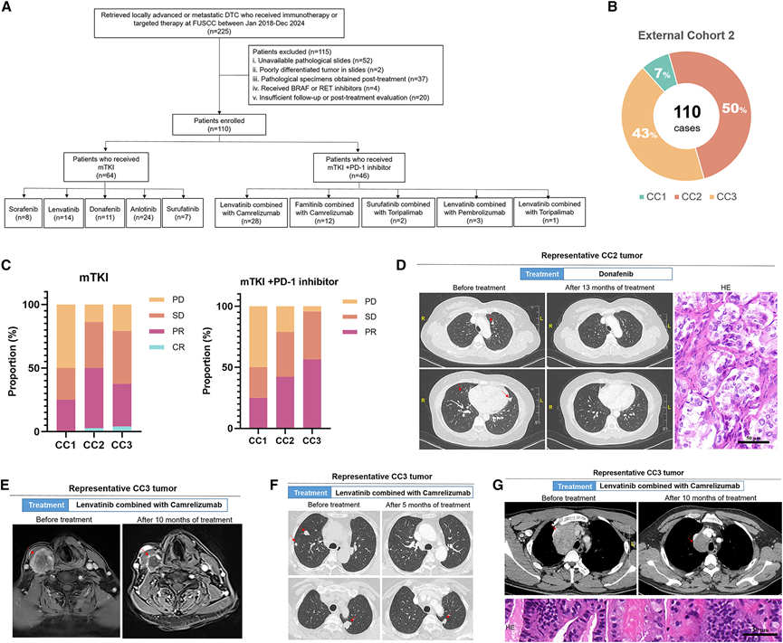 (A) 外部队列 2 的选择过程。(B) 饼图显示了外部队列 2中 CC 亚型的分布。(C) 条形图比较了外部队列 2(n = 110)中 CC 亚型患者单独使用 mTKI 或使用 mTKI + PD-1 抑制剂组合的治疗效果,根据 RECIST v.1.1 标准进行评估。(D) 外部队列 2 中代表性 CC2 肿瘤的胸部 CT。(E) 外部队列 2 中代表性 CC3 肿瘤的颈部磁共振成像。(F) 外部队列 2 中代表性 CC3 肿瘤的胸部 CT。(G) 外部队列 2 中代表性 CC3 肿瘤的胸部增强 CT。