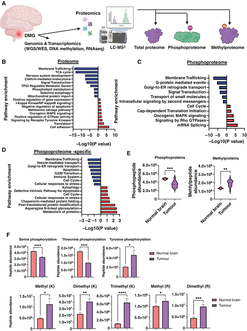 (A) DMG样本的多组学分析流程,包括全基因组测序/全外显子组测序(WGS/WES)、DNA甲基化、RNA-seq、总蛋白质组、磷酸化蛋白质组和甲基化蛋白质组。(B) DMG中差异表达蛋白的通路富集分析。(C) DMG中差异磷酸化蛋白的通路富集分析。(D) DMG中差异表达但磷酸化程度不同的蛋白的通路富集分析。(E) 正常脑组织和DMG组织中蛋白质的整体磷酸化和整体甲基化水平。(F) DMG中丝氨酸、苏氨酸和酪氨酸的整体磷酸化水平,以及DIPG中赖氨酸和精氨酸的整体甲基化水平及其各种修饰。
