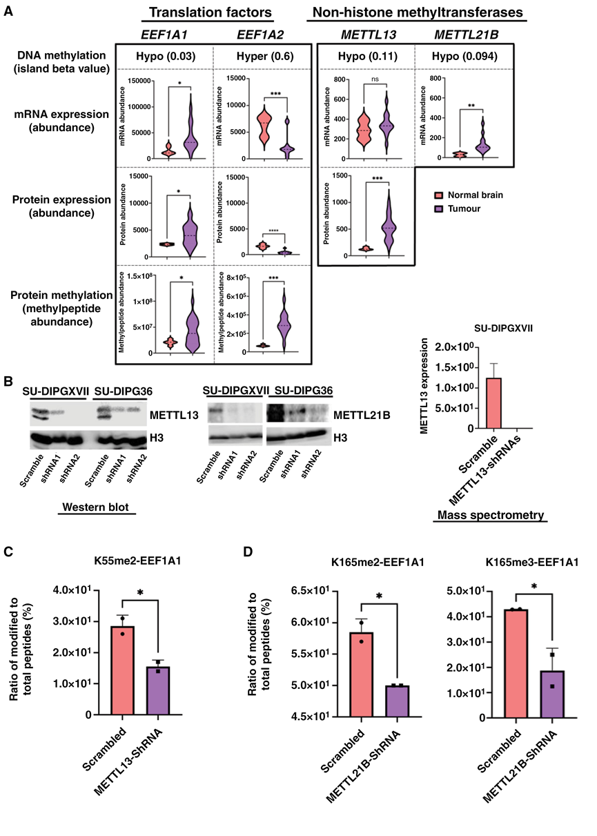 (A) DMG 细胞中 EEF1A1、EEF1A2、METTL13 和 METTL21B 的多组学富集分析。METTL21B 在蛋白质组数据中缺失。(B) 通过蛋白质印迹和质谱分析验证了基于 shRNA 的 METTL13 和 METTL21B 在 DMG 细胞中的敲低效果。(C) 在 SU-DIPG36 细胞中,敲低 METTL13 和 METTL21B 显著降低了 EEF1A1 K55 位点的甲基化水平。(D) 敲低METTL21B显著降低了SU-DIPG36细胞中EEF1A1 K165的甲基化水平。