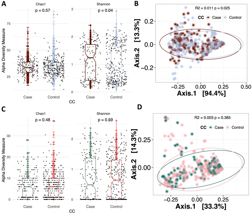 无论是基于分类单元数量(Chao1,p = 0.046)还是考虑到均匀度(Shannon,p = 2.50 × 10 −7 ),CT 病例中的CVM 细菌 α 多样性都更高(图 4 A)。真菌 α 多样性与 CT 病例状态无关(图 4 B)。同样,细菌分析显示,以 β 多样性和 CT 病例状态衡量的组成存在差异(图 4 C),而真菌分析则没有差异(图 4 D)。