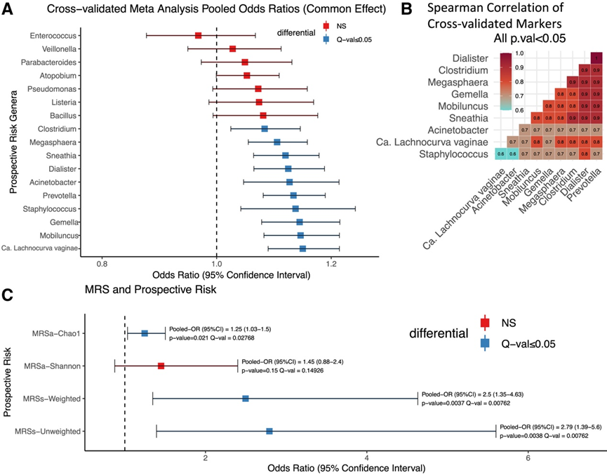 他们评估了单个分类群是否是 CT 发生的独立风险因素或多微生物群落的一部分。首先,他们使用 ANCOM 和 10 倍交叉验证进行了差异丰度分析。经过交叉验证,10 个分类群仍然是 CT 获得的重要标志,其中包括Candidatus Lachnocurva vaginae、Prevotella、Megasphaera和Clostridium以及其他 BV 相关细菌。矩阵分析表明这些分类群属于微生物网络,因为它们高度相关(图 3A-B)。为了进一步研究这些分类群与 CT 风险之间的总体关系,他们采用了微生物风险评分(MRS)(类似于多基因风险评分)。MRS 风险评估值明显高于单个细菌风险评估值,表明细菌群落的重要性(图3C)。