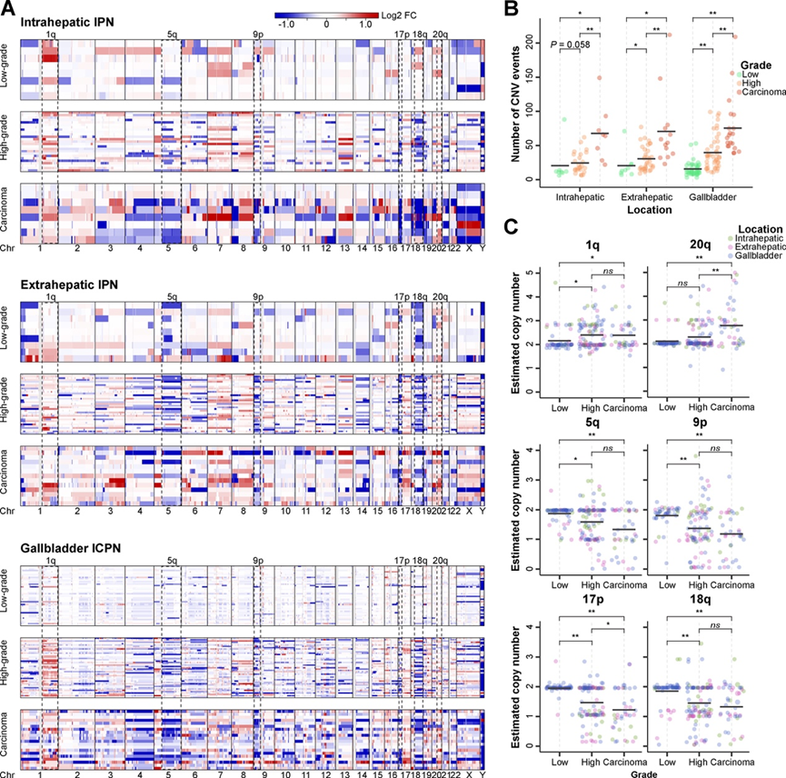 按发育不良等级(LGIN、HGIN 和癌)分层的总体 CNV 模式突出了 IPN/ICPN 和癌中拷贝数变异事件的程度(图 4 A),观察到从 LGIN 和 HGIN 到癌的 CNV 事件数量显著增加(图 4 B)。此外,在 IPN/ICPN 中,HGIN 中观察到的 CNV 事件数量高于 LGIN。在所有 IPN/ICPN 和癌症中,复发性 CNV 事件定义为常见的基因组区域(图 4 A)。在 1q 和 20q 中经常观察到染色体增益。在 IPN/ICPN 和癌症中均检测到了染色体臂 5q、9p、17p 和 18q 的丢失,这些臂分别包含APC、CDKN2A/B、TP53、SMAD2和SMAD4。改变的拷贝数的定量进一步证明从 LGIN 到 HGIN 和癌症逐渐增加(图 4 C)。这些发现强调了 LGIN 和 HGIN 中主要 CNV 事件的早期发生,并逐步发展为癌症。
