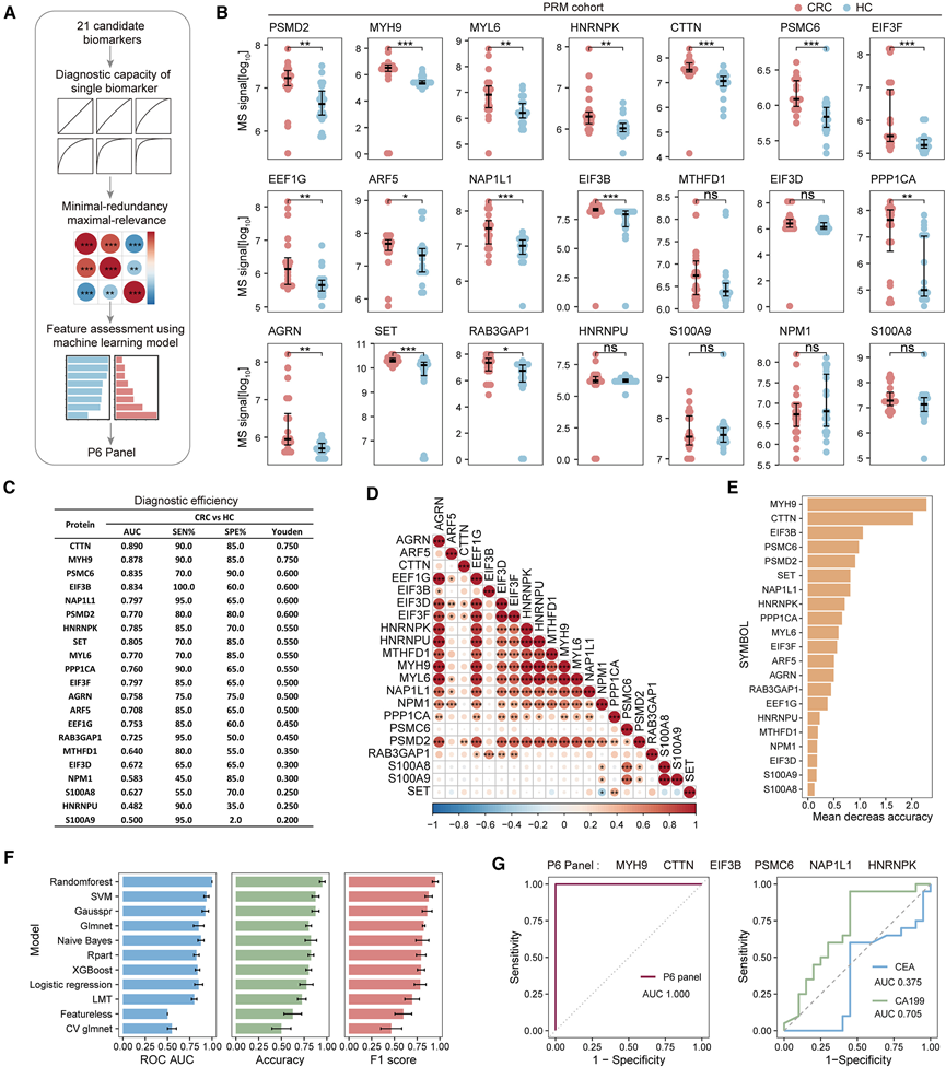(A) 筛选 21 种候选蛋白质以选择适合开发诊断模型的蛋白质的流程图。(B)20 例 CRC 患者和 20 例健康个体中 21 个候选生物标志物的蛋白质丰度箱线图。(C) 单个候选生物标志物的诊断能力和突出显示的蛋白质纳入P6生物标志物组,用于ELISA验证。(D) 21个候选生物标志物的蛋白质丰度相关性。(E) 随机森林算法生成的变量重要性图,以每个变量的准确度平均下降来衡量。(F) 基于三个评估指标[ROC曲线下面积 (AUC)、准确率和 F1 分数]对 10 个最先进的机器学习分类器进行性能基准测试。(G) P6 组的 ROC 曲线在诊断 CRC 方面表现出比 CEA 或 CA19-9 更优异的性能。