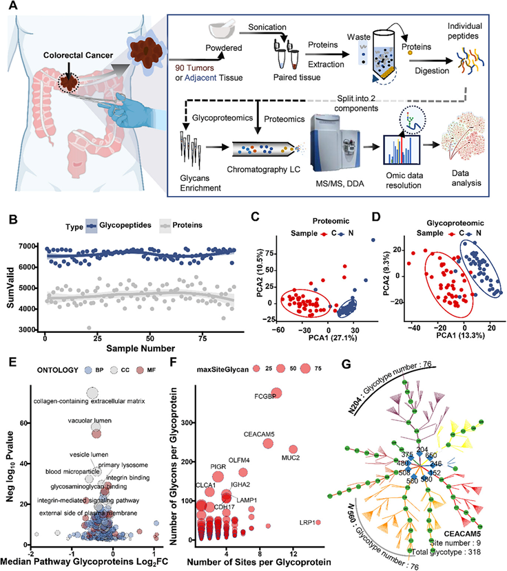 (A) N-糖蛋白质组学样品制备和后续质谱分析的工作流程。(B) 已鉴定的糖肽(红点)和蛋白质(灰点)的数量。(C) 蛋白质组学数据的主成分分析 (PCA)。(D) 糖蛋白质组学数据的 PCA。(E) 糖蛋白的 GO 富集分析。(F) 每种糖蛋白的糖基化位点和 N-糖链数量。(G) CEACAM5 的糖基化位点和糖型。