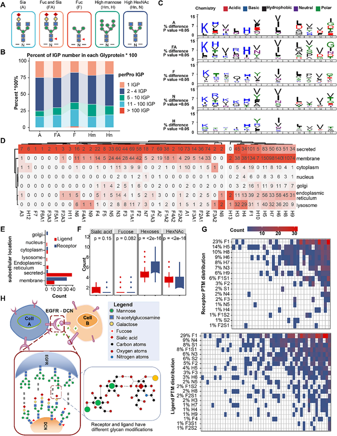 (A) 根据 N-糖链单糖组成定义五种糖型。(B) 单 N-糖基化和多 N-糖基化蛋白质的比例,颜色表示每种蛋白质中 IGP 的数量。(C) 每种糖型的基序组成。不同的颜色代表不同的分类。(D) UniProt 数据库每种糖型的定位类别汇总。(E) 条形图显示本研究数据中检测到的受体(蓝色)和配体(红色)蛋白的 UniProt 定位类别。(F) 受体(蓝色)和配体(红色)蛋白中每种单糖组成的数量。(G) 热图显示每种糖蛋白中各糖型的数量。(H) 基于不同糖型的潜在相互吸引/结合模式。