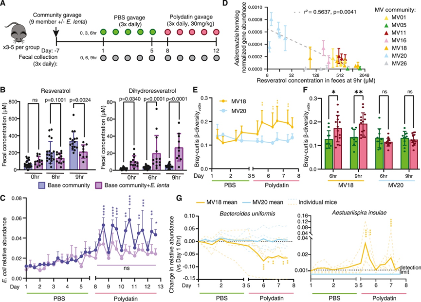 最后,他们检测膳食异生物质群落重塑模型是否适用于哺乳动物肠道环境。以虎杖苷为重点,他们首先将9元多门群落定植于无菌小鼠,分别在有或没有E. lenta的情况下进行,如先前体外表征的那样(图5B)。他们在对照窗口(PBS管饲)和治疗窗口(虎杖苷管饲)期间监测了粪便样本中的微生物组成(图7A)。在治疗窗口期间,粪便白藜芦醇水平约为200μM,与预测的人类结肠浓度一致(图7B)。与E. lenta在肠道中减少白藜芦醇一致,在群落中加入E. lenta会显著改变局部和全身对虎杖苷及其代谢物的暴露:粪便白藜芦醇水平显著降低,而粪便二氢白藜芦醇显著升高(图7B)。此外,在群落中加入E. lenta会显著降低白藜芦醇及其宿主介导的(葡萄糖醛酸化和硫酸化)代谢物的血清水平,并显著升高宿主介导的二氢白藜芦醇代谢物的血清水平。在对照窗口期间,含有和不含E. lenta的群落组成保持稳定,而缺乏E. lenta 的群落则在虎杖苷处理窗口期间每天都会出现紊乱。在紊乱期间,大肠杆菌(对白藜芦醇的生长抑制具有抗性)在虎杖苷处理后,其相对丰度和绝对丰度(以菌落形成单位 [CFU] 衡量)每天增加 3 到 4 倍,并在第二天早上白藜芦醇通过肠道后恢复到基线水平(图 7 C)。与E. lenta将白藜芦醇解毒为二氢白藜芦醇的能力一致,添加E. lenta可保护群落(包括大肠杆菌)免受白藜芦醇苷的破坏(图 7 C)。