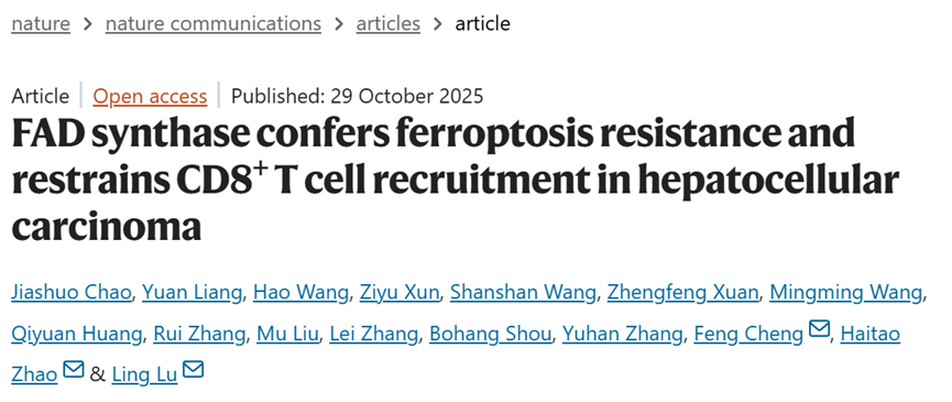 10月29日,《Nature Communications》(IF=15.7)在线发表由南京医科大学、中国医学科学院等顶尖科研团队联合完成的重磅研究成果“ FAD synthase confers ferroptosis resistance and restrains CD8+ T cell recruitment in hepatocellular carcinoma ”。研究首次系统揭示了FADS在肝癌铁死亡抵抗与CD8+ T细胞招募抑制中的双重作用,为肝癌免疫治疗提供了全新靶点。