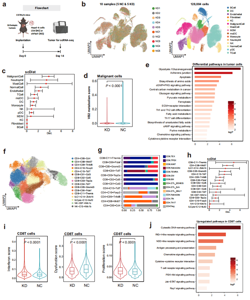 为全面描述FADS对TME的影响,特别是对肿瘤细胞和T细胞的影响,研究人员使用Hepa1-6细胞在C57BL/6小鼠中建立原位肿瘤,第14天收获肿瘤进行scRNA-seq(图3a)。10个样本(5个FADS敲低肿瘤 [KD] 和5个对照肿瘤 [NC])进行单细胞测序,捕获128,884个细胞用于下游分析。无监督聚类识别出29个不同的细胞簇,利用Marker基因鉴定为15种细胞类型(图3b),同时也鉴定了恶性肿瘤细胞。