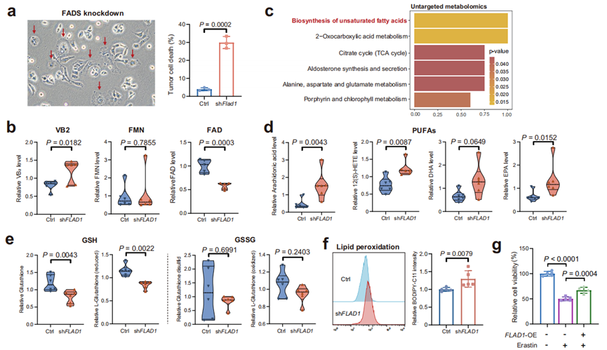 FADS的缺失抑制了HCC细胞的生长,其潜在机制需要进一步研究。单细胞RNA测序分析表明,FADS基因敲低的肿瘤细胞中,与细胞死亡相关的代谢通路显著富集(图3e)。值得注意的是,在FADS敲低HCC细胞中观察到明显的细胞死亡,伴有细胞膜破裂(图5a)。为进一步解析代谢变化,研究团队对FADS敲低的Hep3B细胞进行非靶向代谢组学分析。结果显示,FADS敲低导致VB2水平增加,FAD水平降低,FMN水平无显著变化(图5b)。KEGG富集分析显示,谷胱甘肽代谢和多种脂质代谢途径,包括不饱和脂肪酸的生物合成和花生四烯酸代谢,发生显著改变(图5c)。具体来说,FADS敲低导致促铁死亡的多不饱和脂肪酸及其脂质过氧化产物12(S)-HETE的水平升高(图5d)。谷胱甘肽是主要的抗氧化剂,其水平在FADS敲低细胞中降低(图5e)。此外,在FADS敲低细胞中,脂质过氧化显著增加(图5f, g)。用铁死亡抑制剂Ferrostatin-1处理挽救了FADS敲低引起的细胞死亡,而用铁死亡诱导剂Erastin处理则消除了FADS过表达提供的保护作用(图5g)。这些结果表明FADS促进了细胞对铁死亡的抵抗,其缺失会诱导铁死亡。
