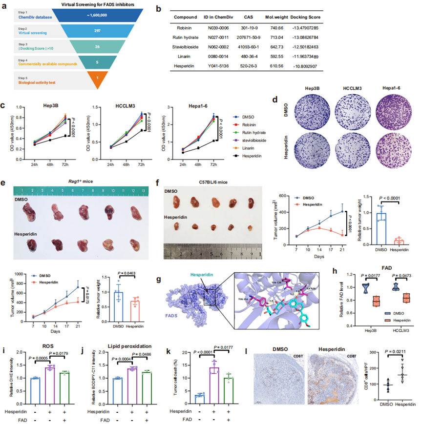 目前,尚无可用的FADS抑制剂。为解决这一空白,研究团队进行了基于结构的高通量虚拟筛选,使用ChemDiv数据库(1,583,358种化合物)来搜索潜在的FADS抑制剂(图7a)。结合口袋设置在FADS C末端,包含酶催化中心。经过三轮筛选并应用对接得分大于10为阈值,将选择范围缩小到26个排名靠前的化合物。其中,五种商业可用且可大规模生产的化合物,被选作实验验证(图7b)。其中,橙皮苷在抑制细胞增殖方面表现出最有效的效果(图7c, d),临床上,橙皮苷也是已批准药物产品中的活性成分。