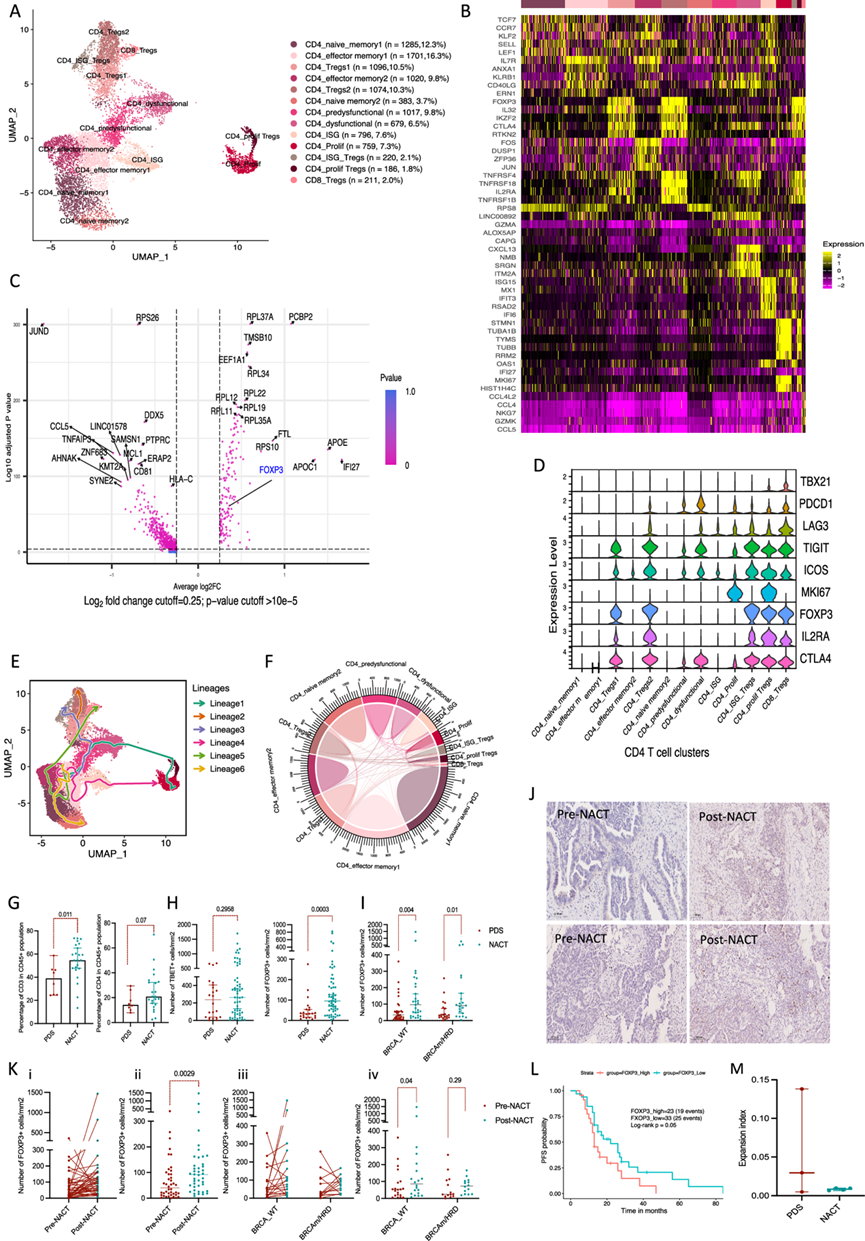 (A) UMAP 显示 7 名患者的整合 CD4 T 细胞聚类,NACT 前和 NACT 后分别为 4492 个和 5935 个细胞。(B) 热图显示每个聚类中上调最多的五个基因。(C) NACT与 PDS 中的差异表达基因分析。(D) 小提琴图显示 CD4聚类中不同 Tregs 和耗竭基因的表达。(E) CD4 细胞亚群的Slingshot轨迹分析。(F) Circos图显示 CD4 细胞聚类中的 TCR 和共有克隆。(G-I)流式细胞分析。(J)免疫组织化学分析。(K) 流式细胞分析。(L) Kaplan-Meier 生存曲线。(M) 通过 STARTRAC 研究的 PDS 和 NACT 中的 CD4 TCR 扩增指数。