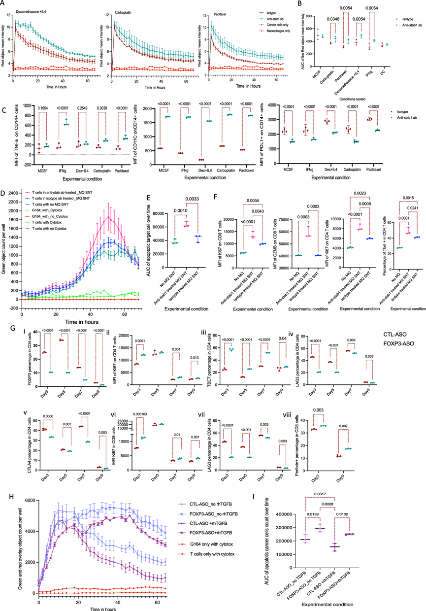 (A) Incucyte 人巨噬细胞吞噬曲线。(B)曲线下面积 (AUC)。(C) 流式细胞分析。(D) Incucyte S3曲线显示 T 细胞杀伤G164 卵巢癌细胞系。(E) AUC分析。 (F) T 细胞的流式细胞分析。(G) FOXP3-ASO 随时间的影响。(H) Incucyte S3曲线显示 T 细胞随时间杀死 G164 细胞的情况。(I) T 细胞杀伤曲线的 AUC。