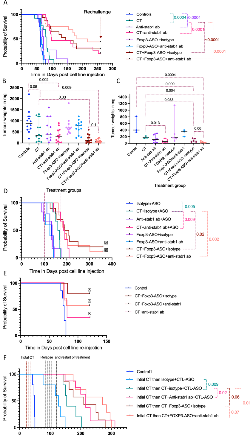 他们用抗 STAB1 抗体或 FOXP3-ASO(AZD8701 的鼠类替代物)作为单一疗法和与 CT 联合治疗患有已确诊腹膜疾病的 HGS2 小鼠。实验进行了两次,包括对照、CT、抗 STAB1 抗体作为单一疗法或与 CT 联合、FOXP3-ASO 作为单一疗法或与 CT 联合,以及 CT、抗 STAB1 抗体和 Foxp-3-ASO 的三重组合组。小鼠在任何治疗中均未表现出任何自身免疫或其他不良反应的迹象。抗 STAB1 抗体与 CT 联合使用可显著提高小鼠的存活率,而单纯使用 CT 则可提高 98 天和 83 天,P = 0.0001,其中 15 只小鼠中有 3 只可长期存活。此外,FOXP3-ASO 与 CT 联合使用可显著提高小鼠的存活率,而单纯使用 CT 则可提高 145 天和 83 天,P < 0.0001,其中 17 只小鼠中有 5 只可存活超过 250 天。FOXP3-ASO 与 CT 和抗 STAB1 抗体的三重组合比单独使用 CT 和 CT 加抗 STAB1 抗体以及 CT 加 FOXP3-ASO提高了生存率,在三重组合治疗组中,十六只小鼠中有七只存活超过 250 天。抗 STAB1 抗体单一疗法可带来较小但具有统计学意义的生存益处。FOXP3-ASO 单一疗法和与抗 STAB1 抗体联合疗法均未带来生存益处。与对照组或单独进行 CT 治疗相比,CT 加抗 STAB1 抗体治疗组、CT 加 FOXP3-ASO 组和三联治疗组在人道主义终点时的腹膜肿瘤重量明显较低(图 6B)。在对相同治疗组进行的进一步实验中,他们在 70 天时收获了肿瘤。CT 加抗 STAB1 和/或 FOXP3-ASO 治疗组的肿瘤重量明显低于对照组和 CT 治疗组(图 6C)。