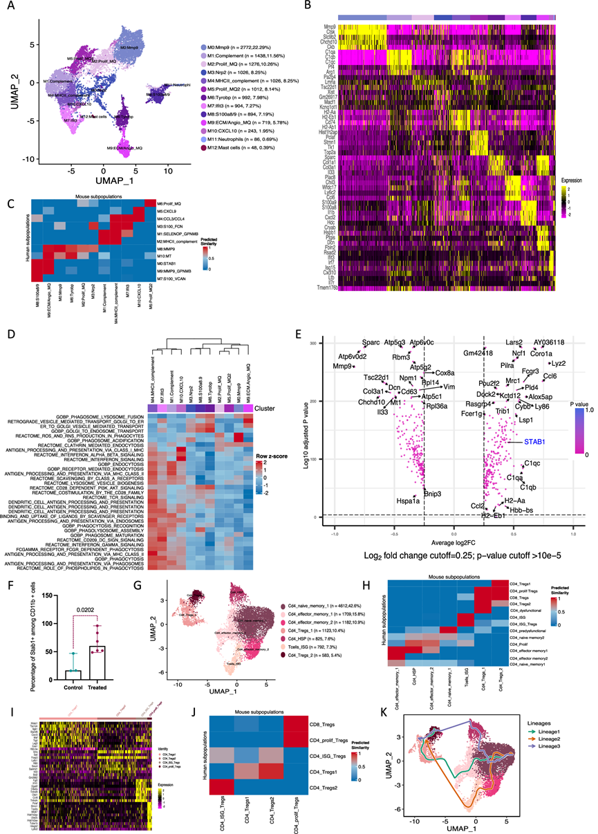 (A) 小鼠巨噬细胞亚群的整合 UMAP。(B) 每个聚类上调前五个基因的热图。(C) HGS2和人类髓系细胞聚类之间的相似性分析。(D) 使用GSVA 分析在巨噬细胞聚类中差异富集的通路。(E) CT治疗小鼠与对照小鼠的差异表达基因。(F) 使用流式细胞技术检测 HGS2 网膜肿瘤巨噬细胞中 STAB1 阳性细胞的百分比。(G) 对照小鼠和 CT 治疗小鼠的整合小鼠 CD4 亚群的UMAP。(H) HGS2 和人类 CD4 细胞聚类之间的相似性分析。(I) 每个 Tregs 聚类的上调基因的热图。(J) 人类和小鼠Tregs 细胞聚类之间的相似性分析。(K) CD4 T 细胞的Slingshot轨迹分析。