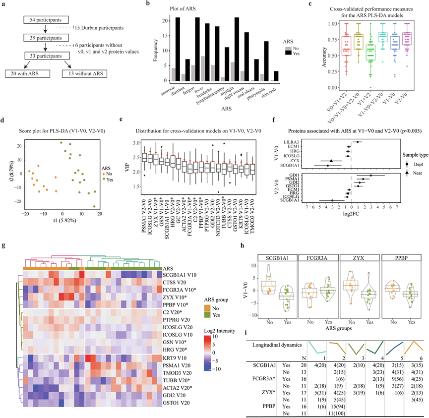 (a) 流程图表示ARS分类中使用的样本总数和排除标准。(b) 条形图比较了患有和不患有 ARS 的参与者 (N = 33) 之间的 AHI 症状分布。(c) 箱线图显示基于以下数据集的 ARS PLS-DA 模型的交叉验证性能指标(准确度)的结果。(d) 基于 ( c ) 中的V1 -V0 + V2-V0 数据集(具有最高准确度值)的分数图,表示每个样本的组成员身份。(e) 箱线图显示了基于 V1-V0 或 V2-V0 的 PLS-DA 模型中每种蛋白质的投影变量重要性 (VIP) 分数。(f) 森林图表示与感染前水平(分别为 V1-V0 和 V2-V0)相比,在估计感染日期 (EDI) 后 2 周和 1 个月显著差异表达的蛋白质的效应大小和 95% 置信区间。(g) 基于所选蛋白质的 V1-V0 和 V2-V0 表达的层次聚类,与 ARS 相关的蛋白质热图。(h)蛋白表达分析。(i) 表格表示与 ARS 相关的蛋白质的纵向蛋白质表达谱。