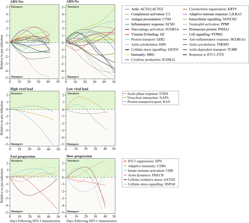 最后,使用滑动窗口方法生成样条曲线,该曲线反映 hAHI 期间血浆中已识别关键蛋白质的基于人群的平均动态(图 6)。绘制了每个研究参与者在 EDI 后样品采集当天的蛋白质水平相对于感染前水平的图表。根据上述分析,选择了与 ARS、病毒控制和疾病进展相关的关键蛋白质。组间比较中具有相似动态的蛋白质排除在本分析之外。结果显示,不同蛋白质的轨迹随时间的推移表现出极大的变化,并表明在 hAHI 期间,过表达蛋白质(定义为stormers)和表达不足蛋白质(定义为slumpers)的动态都很常见。