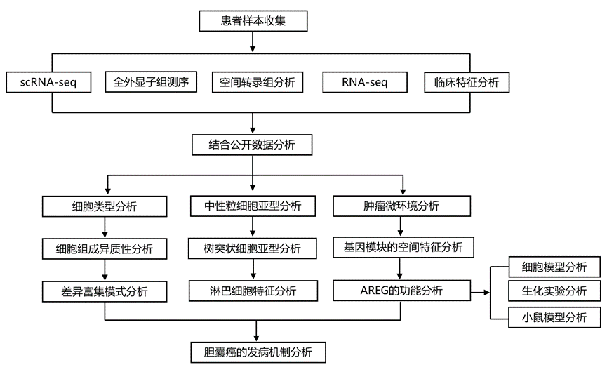 胆道癌包括胆管癌(肝内、肝门周围和肝外)和胆囊癌 (GBC)。GBC通常在晚期才诊断出来,因此预后不佳。肿瘤异质性对理解和治愈癌症构成了重大挑战。然而,单细胞组学技术和计算算法的快速发展使研究者们能够解开肿瘤生态系统的复杂性。人们已投入大量精力来描绘各种癌症类型(包括乳腺癌、肺癌、肝癌、结直肠癌、胰腺癌和胶质母细胞瘤)在肿瘤进展、转移和复发过程中的单细胞景观。然而,对 GBC 的大规模单细胞多组学研究仍然很少,这阻碍了对肿瘤进化的全面了解和有效治疗策略的发展。