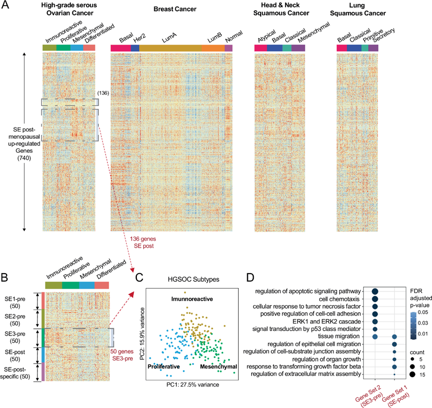 (A) 热图显示了 TCGA 描述的高级别浆液性卵巢癌、乳腺癌 (BRCA)、头颈部鳞状细胞癌 (HNSC) 和肺鳞状细胞癌 (LUSC) 各种分子亚型中绝经后 SE 细胞中上调最多的 740 个基因。(B) 热图显示了 TCGA 确定的卵巢癌分子亚型中绝经前和绝经后 SE 亚型中表达最多的 50 个标志物。(C)对 TCGA 样本(n = 304)进行主成分分析图。 (D) 通路富集分析。
