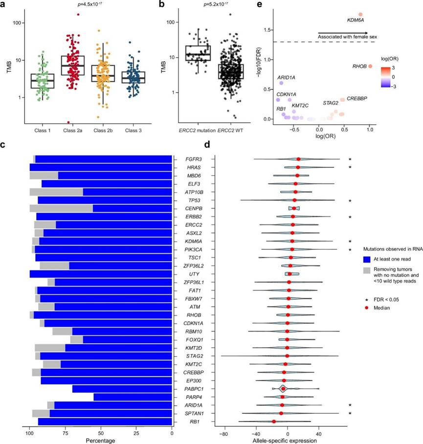 (a) 按 UROMOL2021 转录组类别分层的肿瘤突变负荷 (TMB)。(b) ERCC2突变和ERCC2野生型肿瘤中的TMB。(c) 单核苷酸变异分析。(d) 等位基因特异性表达。(e)女性中突变的富集。