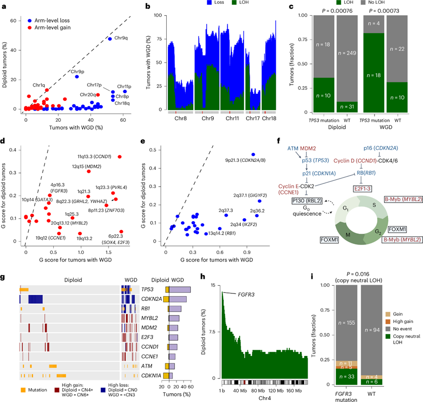 (a) 与二倍体肿瘤的两个拷贝和 WGD 肿瘤的四个拷贝相比,二倍体肿瘤和具有 WGD 的肿瘤在染色体臂水平上发生增益和丢失的百分比。(b) 具有 WGD 的肿瘤中选定染色体丢失(拷贝数 < 4)和/或 LOH 的百分比。(c) 按TP53突变状态和染色体倍性分层的TP53 LOH 肿瘤比例。(d) GISTIC2计算的 G 分数反映了 WGD 肿瘤和二倍体肿瘤中某个区域受局部增益的影响。(e) GISTIC2 计算的 G 分数反映了 WGD 肿瘤和二倍体肿瘤中某个区域受局部缺失的影响。(f) 细胞周期调控中的中心蛋白。(g) 按染色体倍性状态分层的参与细胞周期调控的基因的观察到的基因组改变。(h) 二倍体肿瘤中 chr4 上的拷贝中性 LOH 的百分比。(i) 按FGFR3突变状态分层的二倍体肿瘤中影响FGFR3的拷贝中性 LOH 和增加的分数。