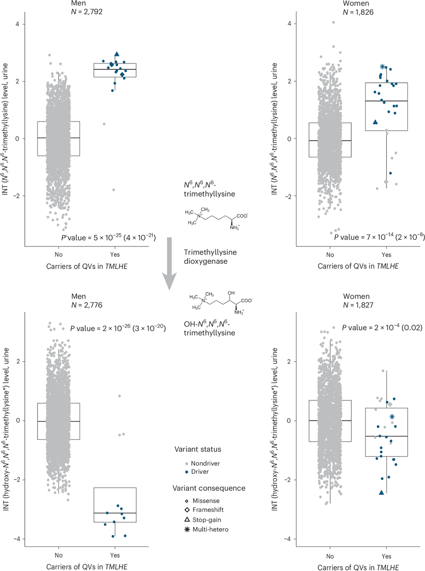 事实上, TMLHE中 QV 的男性携带者的尿液中N6、N6、N6 -三甲基赖氨酸(编码酶三甲基赖氨酸双加氧酶的底物)的水平明显高于女性携带者,而其产物羟基- N6、N6、N6 -三甲基赖氨酸的水平也明显较低,尤其是在关注驱动变体时(图5)。在血浆中,男性 QV 携带者的血浆羟基- N6、N6、N6 -三甲基赖氨酸水平比非携带者低 1.15 sd,而女性 QV 携带者的代谢物水平仅比非携带者低 0.45 sd。在RGN和未命名代谢物 X-23436 的尿液水平中也观察到了类似的趋势。男性和女性携带者的水平都较高,这表明 X-23436 是编码的 regucalcin 催化反应上游的代谢物。GTEx 项目的数据显示,组织间基因表达没有性别差异。因此,代谢物水平的性别差异效应可能代表了所涉及 QV 的杂合性与半合性导致的剂量反应效应。