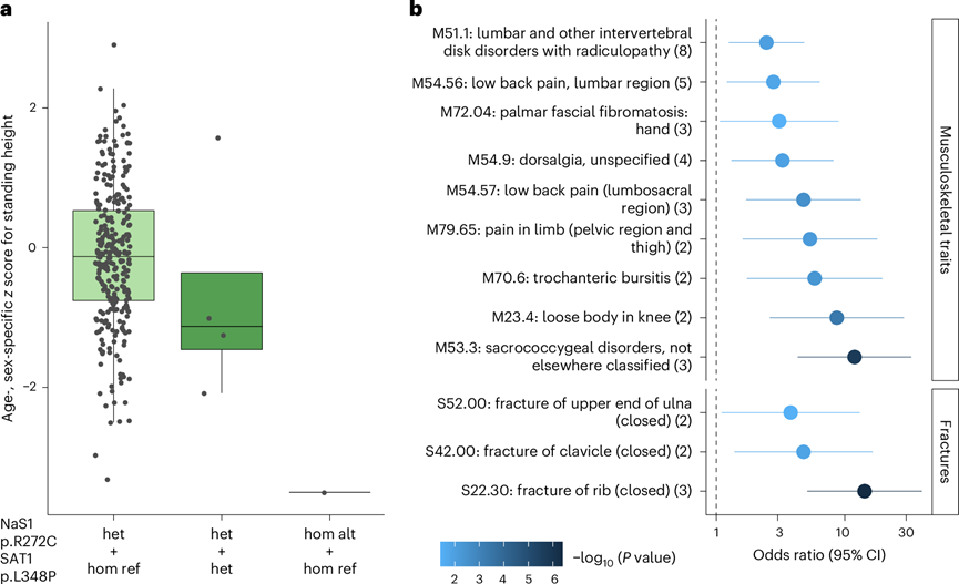 (a) 箱线图显示了p.Arg272Cys 编码等位基因杂合和纯合的 UKB 参与者中年龄和性别特定的站立高度z分数的差异。(b) NaS1 p.Arg272Cys 取代与来自 UKB 的肌肉骨骼疾病和骨折之间的关联。