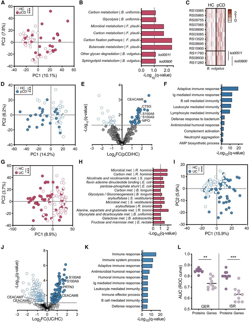 与年龄和性别匹配的健康对照者(GER-HC)相比,一组患有溃疡性结肠炎的德国成年人(GER-UC)表现出同样明显的整体微生物 MIM 转变(图5G),包括显著富集的物种分辨途径,例如Segatella copri中的烟酸和烟酰胺代谢(图5H)。与健康对照者相比,宿主 GER-UC MIM 谱也受到整体干扰(图5I),突出显示了与免疫和抗菌反应相关的多种差异丰富蛋白质(图5J-K)。具体而言,AMP 与细菌属之间的相关丰度分析发现多个分类群(Alistipes、Akkermansia和Coprococcus属)与 IEC 产生的 DMBT1 显著相关,并在 ISR-pCD 队列中部分重现。在 ISR-pCD 和成人 GER-UC 队列中,随机森林模型的预测数据表明,与宏基因组学(基于基因丰度)相比,MIM(基于蛋白质丰度)在区分患病对照和健康对照方面具有明显优越的性能(图 5 L)。