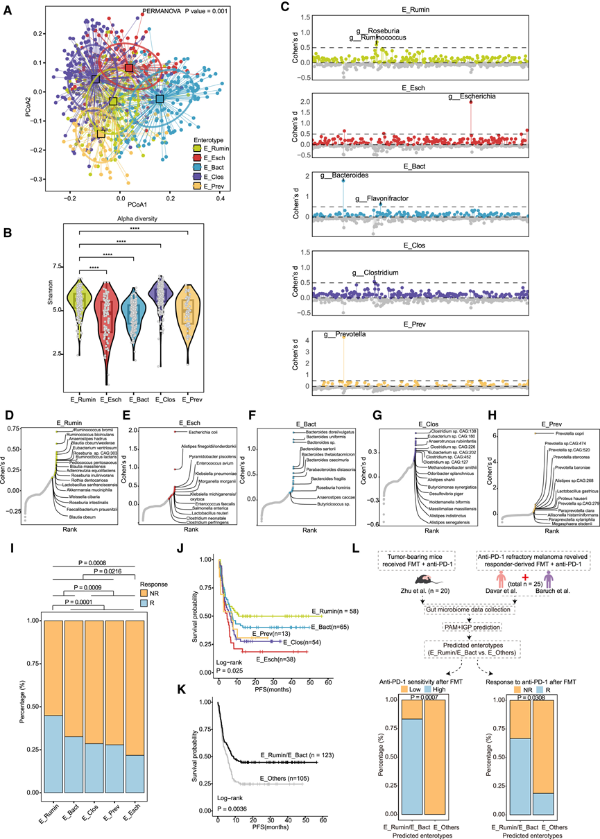 (A) PCoA 图显示五种肠型之间的 β 多样性差异。(B) 肠型间 alpha 多样性 (Shannon) 的小提琴图。(C) 针状图显示每种肠型中占主导地位的属以及 Cohen's d 统计量。(D-H) 散点图显示每种肠型中物种水平的富集细菌。(I) 堆积图显示了R和 NR 在各种肠型中的分布偏好。(J-K)生存分析。(L) 接受 FMT 的小鼠和黑色素瘤患者的肠型预测。