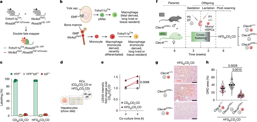 (a-b) 实验方案。(c) 从小鼠中分离的KC中双谱系模型的标记效率 。(d) 从添加 KC 的饲料喂养小鼠中分离的肝细胞培养物示意图。(e) 通过活体成像,在与 CDM CDL CD 或 HFDMCDL CD 小鼠的 KC共培养 4 小时的体外培养肝细胞中以标准化 LD540 强度显示脂质积累。(f) KC耗竭和细胞转移母体肥胖模型的产生。(g) 子代小鼠的肝脏 ORO 染色。(h) ORO 染色进行定量分析。