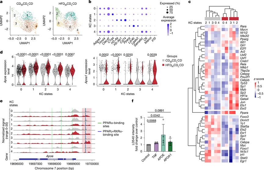 (a) 五种不同 KC 状态的聚类分析。(b) 点图显示每个 KC 状态特异表达的基因。(c) 热图显示 CDMCDLCD 和 HFDMCDL CD 组每个聚类中预测的转录因子活性。(d) 所有 KC 状态下的Apoe(左)和Apoa1(右)的表达。(e) Apoe基因座的 ATAC-seq 峰覆盖图。(f) 在体外培养的肝细胞中,脂质积累情况以标准化LD540强度显示。