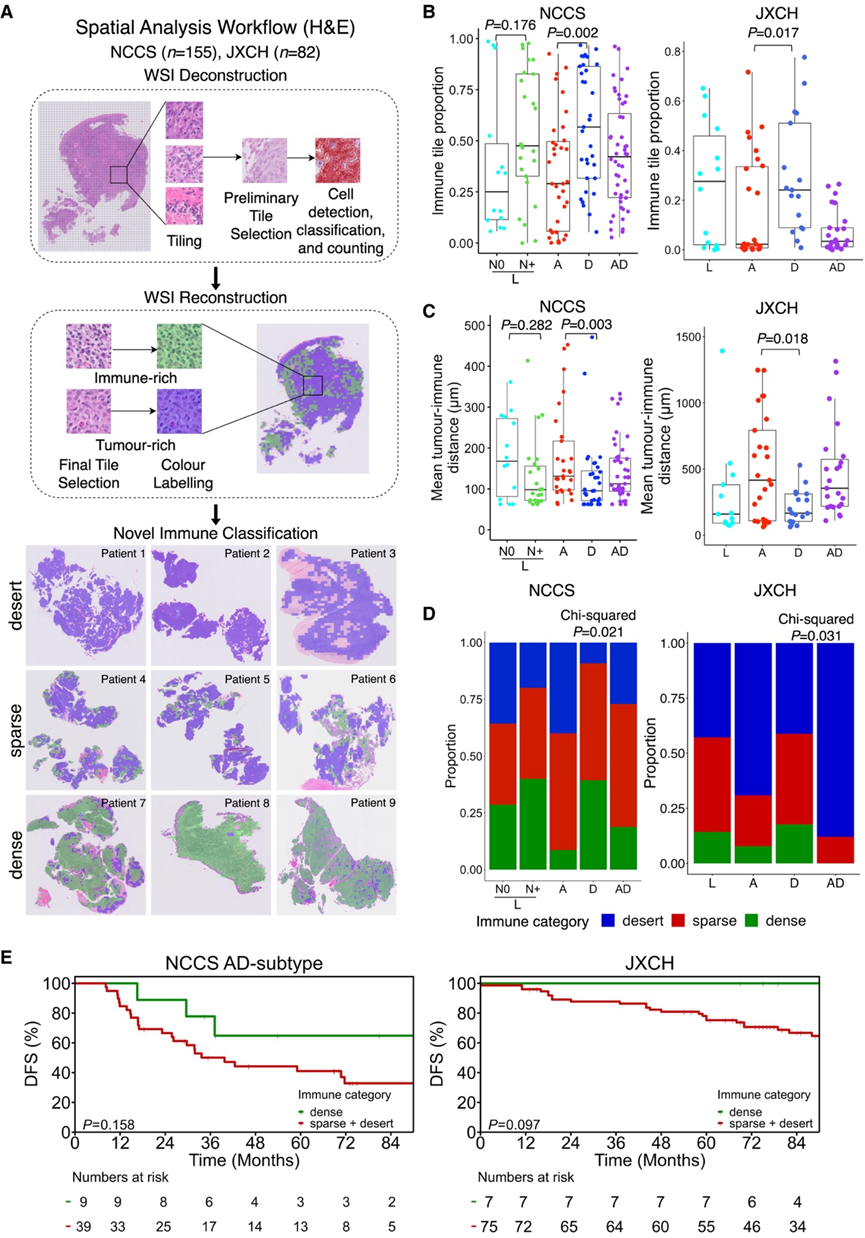 (A) 空间分析的工作流程基于肿瘤 WSI 内免疫富集的空间分布和密度进行免疫分类。(B) 空间分析的工作流程基于肿瘤 WSI 内免疫富集的空间分布和密度进行免疫分类。(C) 四种亚型WSI的平均肿瘤免疫距离。(D) 四种亚型的 WSI 中三种免疫类别的分布。(E) NCCS 和 JXCH 队列中免疫类型与 DFS 的关联。