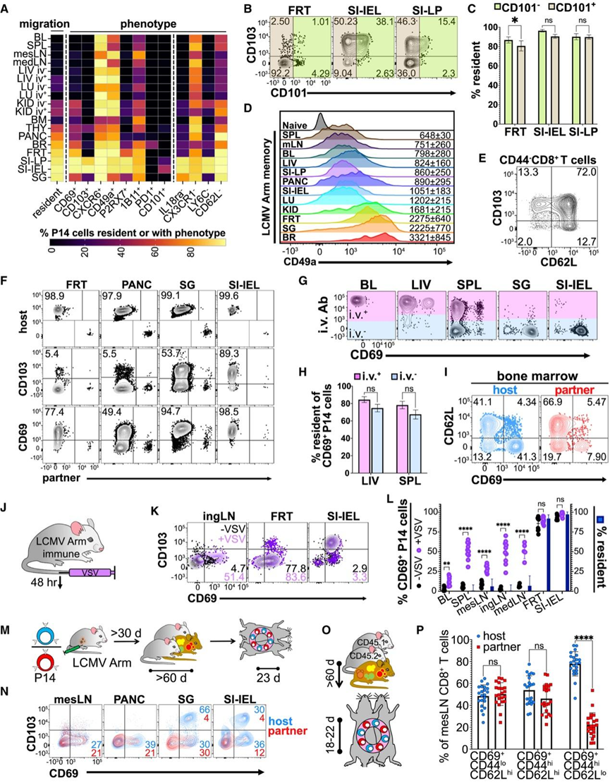 (A) 驻留细胞百分比和表达或缺乏指示标记的总 P14 细胞百分比。(B) 从指定组织分离的 P14 细胞上 CD103 和 CD101 表达的代表性图。 (C) CD101+和 CD101−P14 细胞的驻留百分比。(D) 代表性 CD49a 表达。(E) 代表性 CD49a 表达。(F) 宿主和配对同类基因标记 CD69 和 CD103 在 LCMV Arm 特异性 P14 细胞上的表达。(G-H) 特征性静脉注射抗体和 CD69 染色以及CD69 + P14 细胞的百分比驻留值。(I) 骨髓来源的 LCMV 臂特异性 P14 细胞的 CD69 和 CD62L 表达说明。(J-K) P14 细胞上的 CD69 和 CD103 表达。(L) 表达 CD69 的 P14 细胞百分比(左)和驻留细胞百分比(右)。(M-N) CD69 和 CD103 表达评估。(O) 对共居共生体中的 CD8 + T 细胞进行了 CD44、CD62L 和 CD69 的表达评估。(P) 所示子集中mesLN CD69 +细胞的频率。