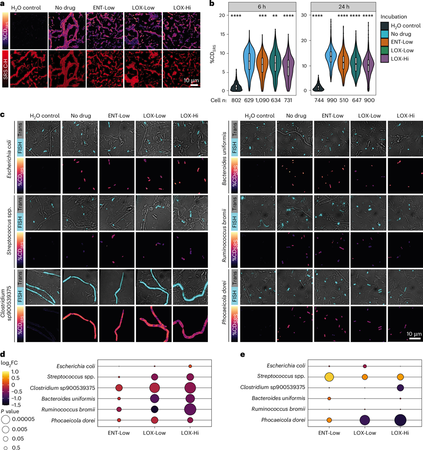 接下来,他们在单细胞水平上评估了这些药物对微生物活动的影响。为了确定药物引起的微生物活动变化,他们在培养液中添加了重水 (D2O) 作为通用代谢示踪剂(图1a)。可以使用受激拉曼散射光谱 (SRS)检测和量化单个微生物细胞从D2O中掺入氘 (D) 产生的 CD 键。他们之前已成功将 SRS 与荧光原位杂交 (FISH) 相结合,通过高通量技术确定肠道微生物组对糖的反应。使用优化的 SRS-FISH 平台,该平台提供比以前的设置更高的通量和灵敏度,他们在药物和对照存在下孵育 6 和 24 小时后测量了约 8000 个单个微生物细胞(图2a-b)。在用 ENT-Hi 孵育的样品中检测到了意外的非振动信号,因此这些样品可排除在活性测量之外,并进一步探究该信号的来源。正如预期的那样,在没有药物的情况下,几乎所有分析的细胞都检测到在培养基中具有活性,90%和 98%的细胞在孵育 6 小时和 24 小时后分别显示高于阈值的 %CD SRS值(图2b)。添加 ENT-Low、LOX-Low 或 LOX-Hi 均导致总活性细胞比例显著降低,单细胞代谢活性也显著降低。LOX-Hi 的降低更为明显,其次是 LOX-Low 和 ENT-Low(图2b)。因此,这些药物明显影响了群落内的微生物活性,即使在短时间培养后,在未检测到对其总体丰度产生影响的条件下也是如此(图1b)。