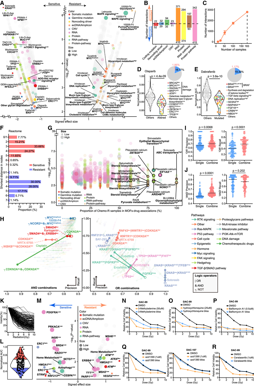 (A) 具有符号效应大小的火山图和与标准化 AUC 相关的显著大效应大小生物标志物。(B) 生物标志物不同分子层中显著的大效应量相互作用的数量。(C) 在模拟下采样的癌症特异性方差分析中,保留的显著大效应量交互作用的数量。(D) 小提琴图显示方差分析鉴定出的奥拉帕尼-MOF关联。(E) 小提琴图显示方差分析鉴定出的达拉非尼与MOF的关联。(F) Reactome 相互作用组中药物靶标和 MOF 之间的最短距离。(G) 药物-MOF 结合的样本比例,将化学-R PancO 与其他 PancO 进行比较。(H) 最优 AND/OR 模型组合图。(I) 单一预测模型(“OR”)与逻辑组合在精确度和召回率上的比较。(J) 单一预测模型(“AND”)与逻辑组合在精确度和召回率上的比较。(K) PancO 对辐射的剂量反应。(L) 小提琴图显示辐射的标准化 AUC,分别分为 3 组。(M) 具有效应大小和与标准化 AUC 相关的生物标志物火山图。(N-R) 单次照射和与所示抑制剂联合照射的辐射响应曲线。