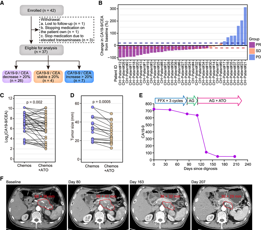 入选的 42 名患者中,1 名失访,1 名自愿停药。除了 3 名患者因氨基转移酶水平升高而停止他汀类药物治疗外,其余患者在整个治疗过程中未发现意外的安全问题。在其余 37 名患者中,初步结果显示,26 名患者(70.3%)在添加 ATO 1 个月后肿瘤标志物(CA19-9 或 CEA)下降超过 20%(图 7 B)。根据迄今为止获得的随访结果,26 名患者的肿瘤标志物水平低于基线的平均时间为 62.35 天。值得注意的是,其中两名患者(CH-Patient#3 和 CH-Patient#15)最初对联合疗法有反应,但后来出现耐药性,肿瘤标志物再次迅速升高。 4 名患者(CH-Patient#7、CH-Patient#9、CH-Patient#14 和 CH-Patient#30)的肿瘤标志物水平稳定,7 名患者(CH-Patient#16、CH-Patient#17、CH-Patient#21、CH-Patient#22、CH-Patient#23、CH-Patient#35 和 CH-Patient#37)尽管接受了联合治疗,但肿瘤标志物水平仍升高(图 7 B)。在可评估的患者中,中位无进展生存期 (PFS) 为 8.05 个月,中位 OS 未达到。总体而言,处于化疗平台期的晚期PDAC患者在化疗方案中添加ATO后,肿瘤标志物水平和肿瘤大小均显著降低(图7 C-D)。例如,CH患者#2在接受三个周期的FFX和AG治疗后已达到平台期,CA19-9水平在超过4个月的时间内波动幅度不超过20%表明其疗效显著。ATO和AG联合治疗取得了显著疗效,肿瘤标志物水平和肿瘤大小均显著降低(图7 E-F)。
