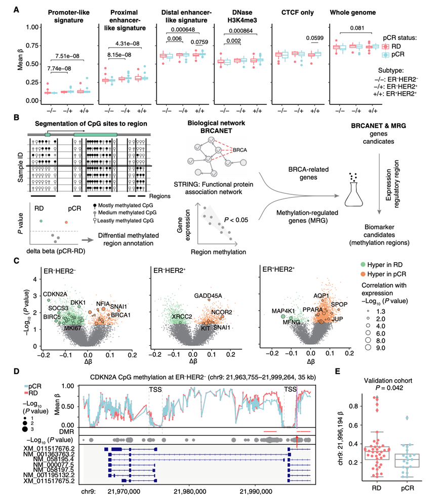 (A) 各亚型中 pCR 和 RD 顺式调控元件的平均甲基化水平。(B) 识别甲基化生物标志物的框架。(C) 各亚型中 pCR 与 RD 的 DMG。(D) ER− HER2−中CDKN2A的 CpG 水平甲基化。(E) 通过焦磷酸测序得到的 chr9: 21996194 处的甲基化水平分布。