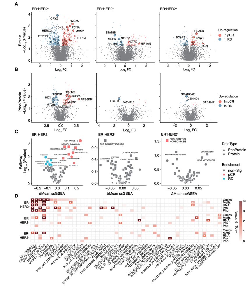 (A-B) 每个亚型中 pCR 和 RD 之间的差异表达蛋白质和磷酸化蛋白。(C) pCR 和 RD 之间的蛋白质和磷酸化蛋白通路差异。(D) 通路富集分析。
