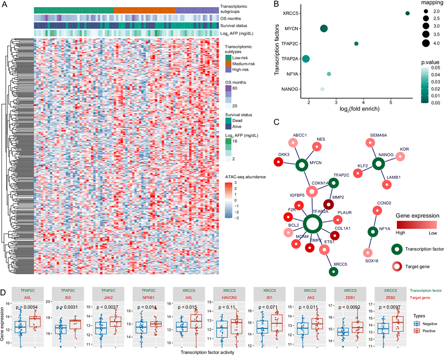 (A) ATAC-seq 检测的差异表达开放染色质区域热图,并按基于 RNA-seq 的亚组分组。(B) 气泡图表示在 ATAC-seq 峰差异表达基因中显著富集的 TF。(C) 显著富集目标基因的 TF 网络,其表达水平根据 RNA-seq 结果确定。(D) 箱线图显示转录活性为 TFPA2C和 XRCC5的患者的基因表达情况。
