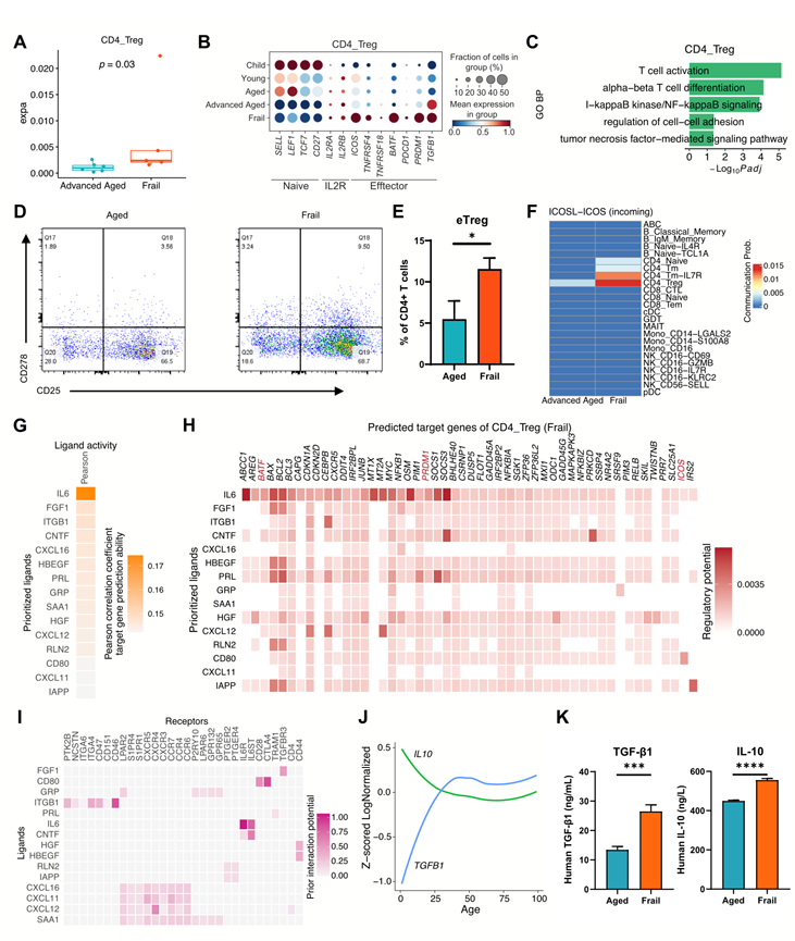 (A)箱线图比较CD4_Treg细胞的TCR克隆扩增。Wilcoxon秩和检验。(B)点图显示不同年龄组CD4_Treg细胞中选定基因的表达情况。(C)与健康高龄个体相比,衰老个体CD4_Treg细胞中上调基因的GO生物学过程项显著富集。(D) eTreg细胞(CD278+ CD25+ CD4+ T细胞)的门控策略。(E)条形图显示CD4 + T细胞中eTreg的百分比。(F)每种细胞类型的ICOSL-ICOS信号传入通信概率。 (G) NicheNet 分析体弱者和高龄供者的 Treg 细胞中上调基因集。热图显示对体弱供者的 Treg 细胞基因表达具有最高预测能力的前 15 种配体。(H) NicheNet 配体-靶基因矩阵热图表示体弱供者的 DEG 的前 15 种配体与 Treg 细胞中靶基因之间的调控潜力。与 eTreg 细胞相关的基因以红色显示。(I) Treg 细胞的潜在受体与图4G的前 15 种配体相互作用。(J) 折线图显示TGFB1和IL10 的表达轨迹随年龄的变化。(K) 老年体弱捐献者的血浆TGF-β1(左)和IL-10(右)蛋白水平。