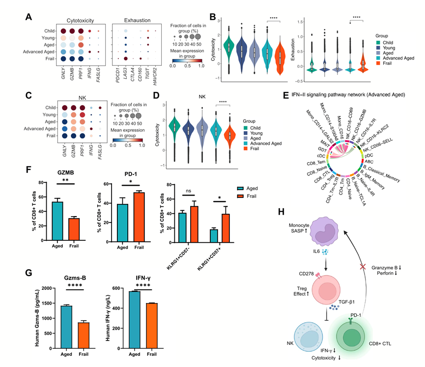 (A)点图显示不同年龄组的 CD8_CTL 细胞中细胞毒性和衰竭相关基因的表达。(B)小提琴图显示不同年龄组的 CD8_CTL 细胞的细胞毒性(左)和衰竭(右)功能评分。(C)点图显示不同年龄组的 NK 细胞中细胞毒性相关基因的表达。(D)小提琴图显示不同年龄组的 NK 细胞的细胞毒性功能评分。(E)弦图显示老年个体 PBMC不同细胞类型之间的 IFN-II 信号通路活性。(F)条形图从左到右显示老年和体弱供体中GZMB +、PD-1 +、KLRG1 + CD57 −和 KLRG1 + CD57 + CD8 + T 细胞的百分比。NS 不显著。(G)老年和体弱供体的血浆中 Gzms-B 和 IFN-γ 蛋白水平。(H)体弱老年人外周免疫细胞炎症反应增强和免疫抑制的示意图。