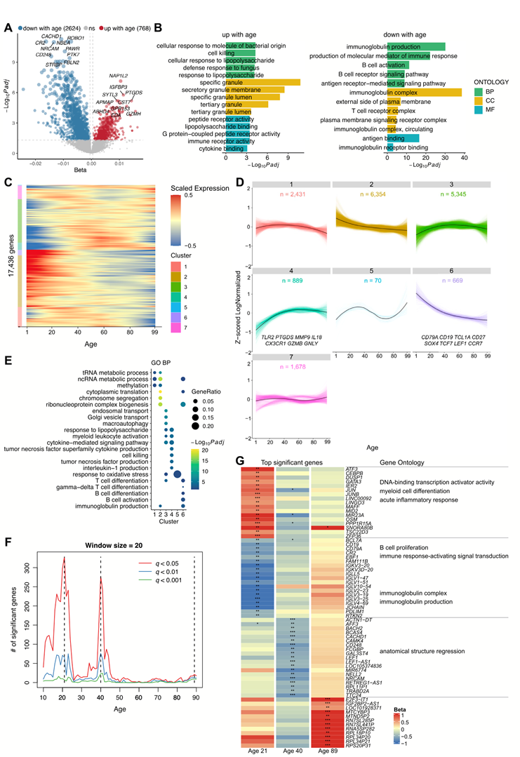 (A) 火山图显示 PBMC 基因表达随年龄的变化。(B)GO分析。(C) 由 LOESS得到的基因表达轨迹随年龄变化的热图。无监督层次聚类将具有相似轨迹的基因分为七个聚类。(D) 折线图显示了基因表达轨迹随年龄的变化,并根据无监督层次聚类划分为聚类。(E)GO分析。(F) 折线图显示随年龄变化的差异表达基因数量。(G)差异表达基因和通路分析。