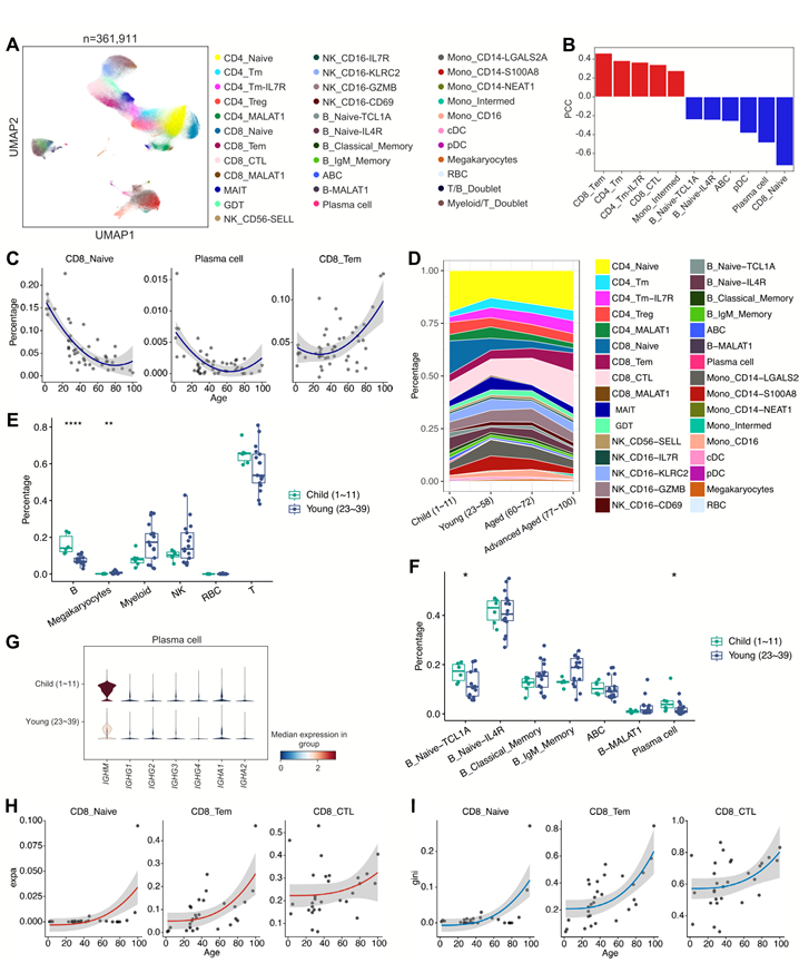 (A)PBMC 单细胞聚类的 UMAP(均匀流形近似和投影)可视化。不同的细胞类型用不同的颜色表示。(B)根据健康个体 PBMC scRNA-seq 数据,细胞类型比例随年龄变化的 PCC。仅显示 PCC 绝对值 > 0.2 的细胞类型。(C)PBMC 中细胞类型比例(y轴)与个体年龄(x轴)的散点图。(D)各定义细胞类型比例随年龄组的变化。(E)用于比较儿童和青少年样本组之间主要细胞类型比例的箱线图。 (F)儿童与青少年样本组B细胞亚型比例比较箱线图。(G)小提琴图显示儿童与青少年样本组浆细胞免疫球蛋白相关基因表达水平。(H)选定T细胞亚型的TCR克隆扩增(y轴)与年龄(x轴)的散点图。(I)与(H)相同,但用于TCR组库与年龄的基尼系数。