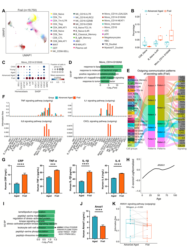 (A)体弱个体外周血单核细胞(PBMC)的scRNA-seq 数据的UMAP 可视化。不同细胞类型用不同颜色表示。(B)用于比较体弱和健康老年个体中特定细胞类型比例的箱线图。(C)点图显示不同年龄组 Mono_CD14-S100A8 细胞中特定基因的表达情况。(D)与健康老年个体相比,体弱个体的 Mono_CD14-S100A8 细胞中上调基因的 GO 生物过程显著富集。(E) 推断的衰老的分泌细胞的传出通讯模式,显示了推断的潜在模式与细胞群以及信号通路之间的对应关系。(F) 条形图显示高龄和衰老供体每种细胞类型的TNF、IL1、IL6和CXCL信号通路的传出信息流。(G) 供体的血浆CRP、TNF-α、IL-1β和IL6蛋白水平。(H) 折线图显示ANXA1表达随年龄的变化轨迹。 (I) 75岁及以上捐献者的RNA-seq样本中,与ANXA1正相关(PCC > 0.7)基因的显著富集。图中显示了在白细胞间粘附中富集的基因。(J) 与(G)相同,但针对的是Anxa1蛋白。(K) 箱线图比较了老年和体弱老年人各细胞类型ANXA1信号通路的信息流。每个配对点对应两个样本组中相同细胞类型的两个细胞群。
