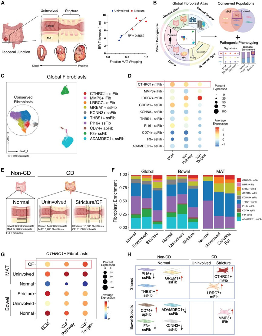 (A) 示意图(上)和大体横截面(下),取自CD儿童回肠切除标本,涵盖狭窄段至远端未受累(UI)肠段,并可见MAT包裹(箭头,黑色轮廓)(左)。(B) 示意图显示了促纤维化 CF 衍生成纤维细胞的鉴定。(C) 对 101189 个独立重新聚类和整合的成纤维细胞进行均匀流形近似和投影(UMAP)。(D) 成纤维细胞亚群中 ECM 和 YAP 特征表达量的标度平均点图。(E) CD 患者和非 CD 患者全层小肠和 MAT 样本疾病状态比较示意图。(F) 成纤维细胞亚群富集情况的条形图。(G) 不同疾病状态下CTHRC1+成纤维细胞中 ECM 和 YAP 特征表达量的散点图。(H) CD狭窄处成纤维细胞异质性的示意图。