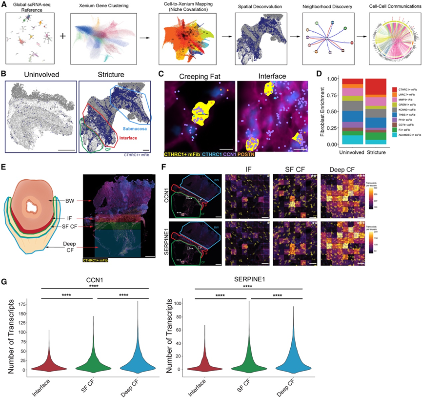 接下来,他们推测CTHRC1+成纤维细胞会定位于狭窄处的纤维化区域。为了识别这些区域,采用了一种多模态方法,将ECM超微结构分析与Visium ST软件相结合(图2A)。最初观察到,MAT-BW 肠道交界处(IF)区域在固有肌层(MP)下方存在一层较厚的纤维化层(图2B)。因此,他们将狭窄或未受累的肠道组织划分为三个不同的区域:未受累和狭窄的BW区域(穿过MP的管腔)以及IF区域(MP和CF之间的基质),后者仅存在于狭窄的肠道中。然后,他们对用天狼猩红染色的样本进行成像,定量了294个ECM超微结构参数,进行了降维处理,并赋予从正常到纤维化的ECM递增的值,他们将其称为纤维化伪时间。ECM超微结构分析显示,IF区域的ECM超微结构倾向于聚集在远离未受累ECM超微结构的区域,且其纤维化伪时间值显著高于其他区域(图2C-D)。与先前的超微结构分析结果一致,这些发现表明CF/BW IF区域可能是晚期狭窄中纤维化的主要部位。
