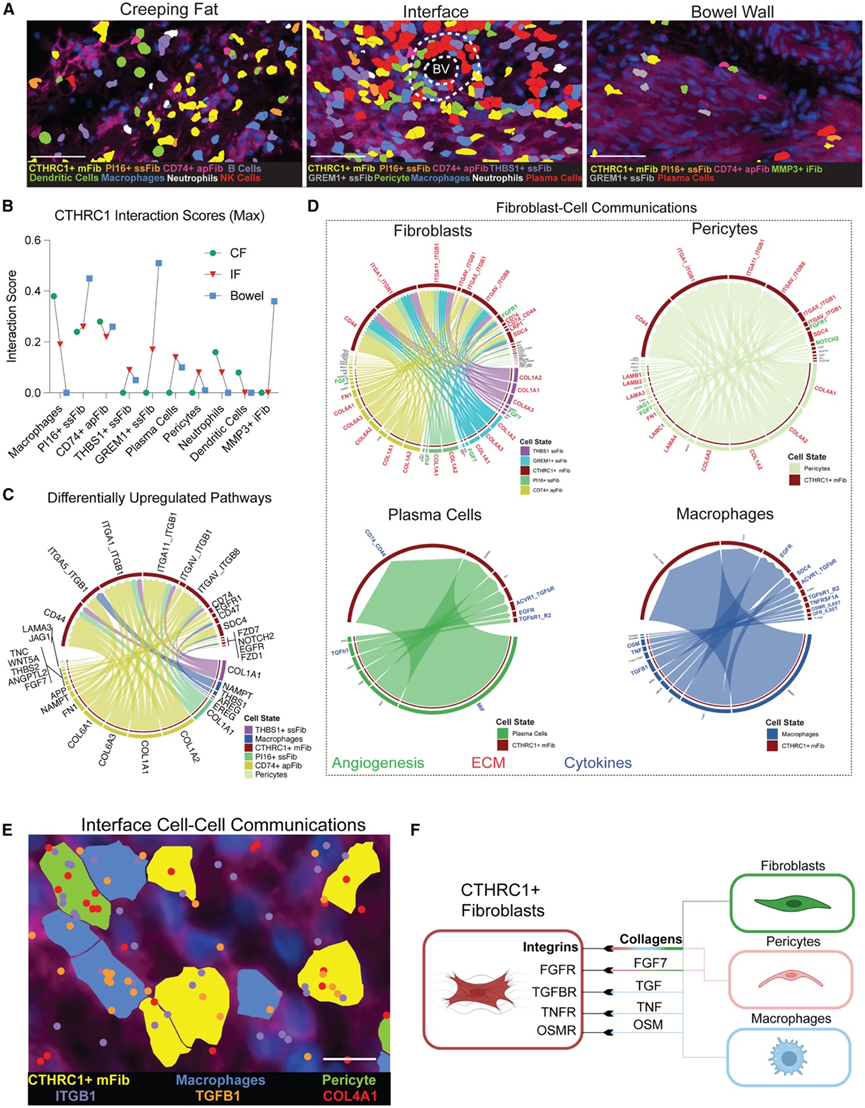 (A) 代表性的免疫荧光区域,显示DAPI(蓝色)和ATP1A1/CD45/E-钙黏蛋白(品红色)染色,以及CF(左)、IF(中)和BW(右)中CTHRC1 +邻近区域的预测细胞类型标记。(B) 折线图描绘了儿科狭窄中 CF(绿色圆圈)、IF(红色三角形)和 BW(蓝色方块)中预测的CTHRC1 + 成纤维细胞与邻近细胞之间的最大归一化相互作用得分。(C) CellChat 绘制的 CD 图谱中CTHRC1+邻域中差异上调的配体-受体相互作用的弦图。(D) 弦图显示了来自 CellChat CD 图谱的CTHRC1+成纤维细胞与邻近成纤维细胞(左上)、周细胞(右上)、浆细胞(左下)和巨噬细胞(右下)之间显著上调的相互作用。(E) DAPI(蓝色)和ATP1A1/CD45/E-钙黏蛋白(品红色)的代表性免疫荧光区域显示了CTHRC1+成纤维细胞(黄色)、巨噬细胞(蓝色)和周细胞(绿色)的预测定位。(F) 示意图总结了CTHRC1+成纤维细胞与邻近细胞之间的主要相互作用。