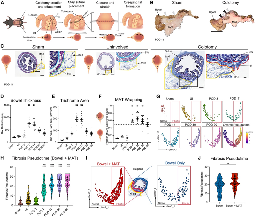 (A) 从上方(上)和横截面(下)观察,在张力下创建结肠切开术以产生纤维化和CF的示意图。(B) 术后第 14 天分离的假手术(左)和结肠切开术(右)肠道的宏观图像。(C) 术后第14天假手术组、尿路感染组和结肠切开组的Masson三色染色。(D-F) MAT 邻近肠壁 (MAT-ADJ) 的平均肠壁厚度和归一化三色阳性面积的散点图,以及 MAT 覆盖的肠壁比例的时间进程、假手术和尿失禁 (POD 14)。(G) 分别绘制肠道中 ECM 超微结构的时间进程图、假手术组(POD14)和 UI 组(POD 3-90)的 UMAP 图,分别对应有无 MAT 的情况。(H) 小提琴图显示了仅用 MAT 处理的肠道中 ECM 超微结构的时间进程、假手术(POD 14)和 UI(POD 3-90)的伪时间。(I) 结肠切开术后第 7 天至第 90 天,仅肠道(右)或肠道与 MAT(左)的 ECM 超微结构 UMAP 图像。(J) 结肠切开术图像中,从术后第 7 天到第 90 天,仅肠道和肠道与 MAT 的 ECM 超微结构伪时间的提琴图。